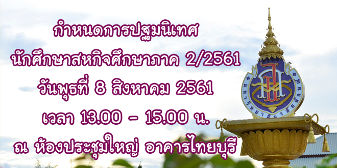 แจ้งกำหนดการประชุมปฐมนิเทศนักศึกษาที่จะออกปฏิบัติสหกิจศึกษา ภาคการศึกษาที่ 2/2561 วันพุธที่ 8 สิงหาคม 2561 เวลา 13.00 – 15.00 น. ณ ห้องประชุมใหญ่ อาคารไทยบุรี