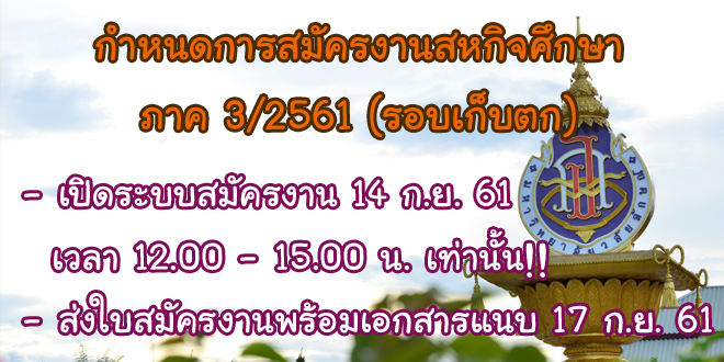 ประกาศ!! ศูนย์สหกิจศึกษาฯ ขอแจ้งการสมัครงานสหกิจศึกษา ภาคการศึกษาที่ 3/2561 สำหรับนักศึกษาที่ยังไม่ได้ทำการสมัครงานตามวันเวลาที่กำหนด (รอบเก็บตก) โดยทำการเปิดระบบตามรายละเอียดดังนี้